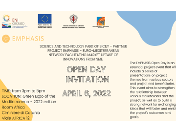 INVITO OPEN DAY - Progetto EMPHASIS - 6 Aprile 2022 – ore 15.00/17.15 – c/o ECOMED Green Expo del Mediterraneo 2022 – Ciminiere di Catania Viale Africa n. 12 Il Progetto Emphasis mira a…
